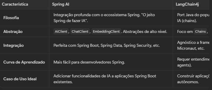 • O ecossistema moderno de IA em Java: Spring AI vs. LangChain4j.
