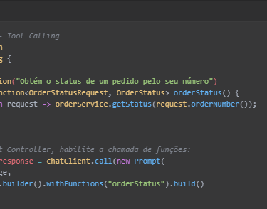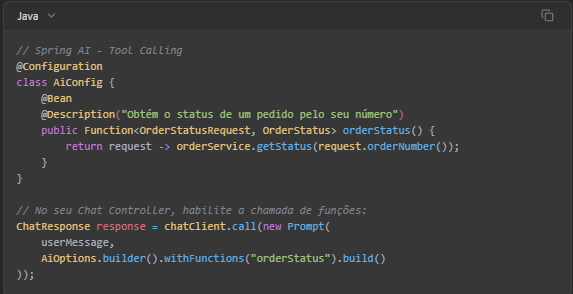 • Chamada de Funções (Tool Calling): Permitir que o LLM invoque funções Java para interagir com sistemas externos.