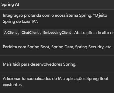 4 Integração com Legado: A vasta maioria dos sistemas empresariais do mundo roda em Java. A capacidade de chamar um serviço de IA diretamente de um EJB em um servidor WebLogic ou de um microserviço Spring Boot é uma vantagem imensa sobre ter que construir pontes complexas para um serviço Python isolado.