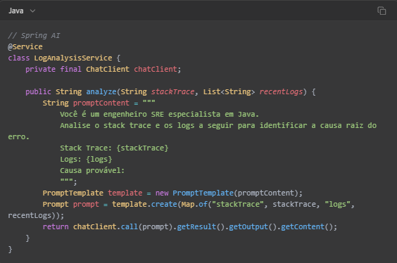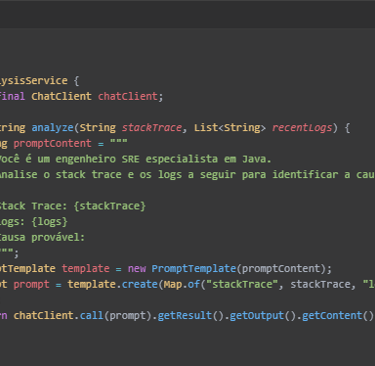 Solução: Um serviço que recebe uma exceção e usa um LLM para analisar logs relevantes e sugerir a causa provável.