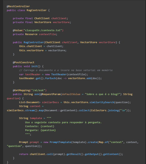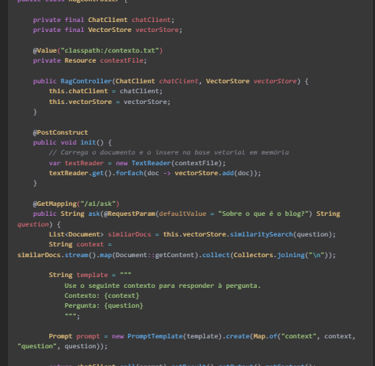 Inicie sua aplicação Spring Boot. Acesse http://localhost:8080/ai/ask?question=Qual o foco do blog? no seu navegador. A API deverá responder com base no conteúdo do seu arquivo contexto.txt.